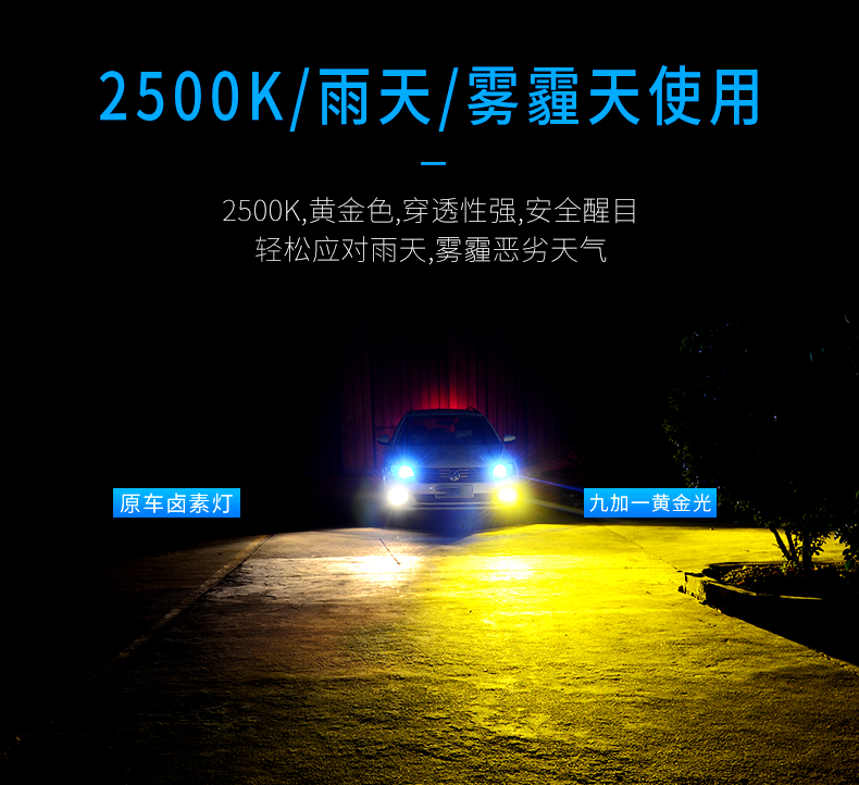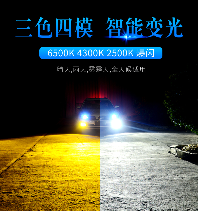| 产品说明 | 这一款变色灯是三色四模的使用结构,升级高亮,适用于各种环境气候是其(8)的特点,晴天,雨天,雾霾天,全天候适用。6500K晴天适用,6000K纯白光,显色性好,照路清楚,不易视觉疲劳。4300K轻雾天适用,4300K色温,也叫黄白光,暖白光,晴天、薄雾天使用。2500K雨天,2500K黄金光,穿透性强,安全醒目,轻松应对雨天、雾霾天等恶劣天气。对比传统的卤素灯,变色灯效果更佳。采取四块铜基,四倍导热。九加一变色灯,创新采用4块铜基导热,导热速度是普通LED大灯的4倍以上。该产品芯片间距更小,其光源间距仅0.9MM,近光切线更标准,远光更聚光。在使用方面一开一关,即可轻松变光。汽车启动默认灯光为白光,关掉再开为4300K黄白光。![]() ![]() ![]() ![]() ![]() ![]() ![]() ![]() ![]() ![]() ![]() |