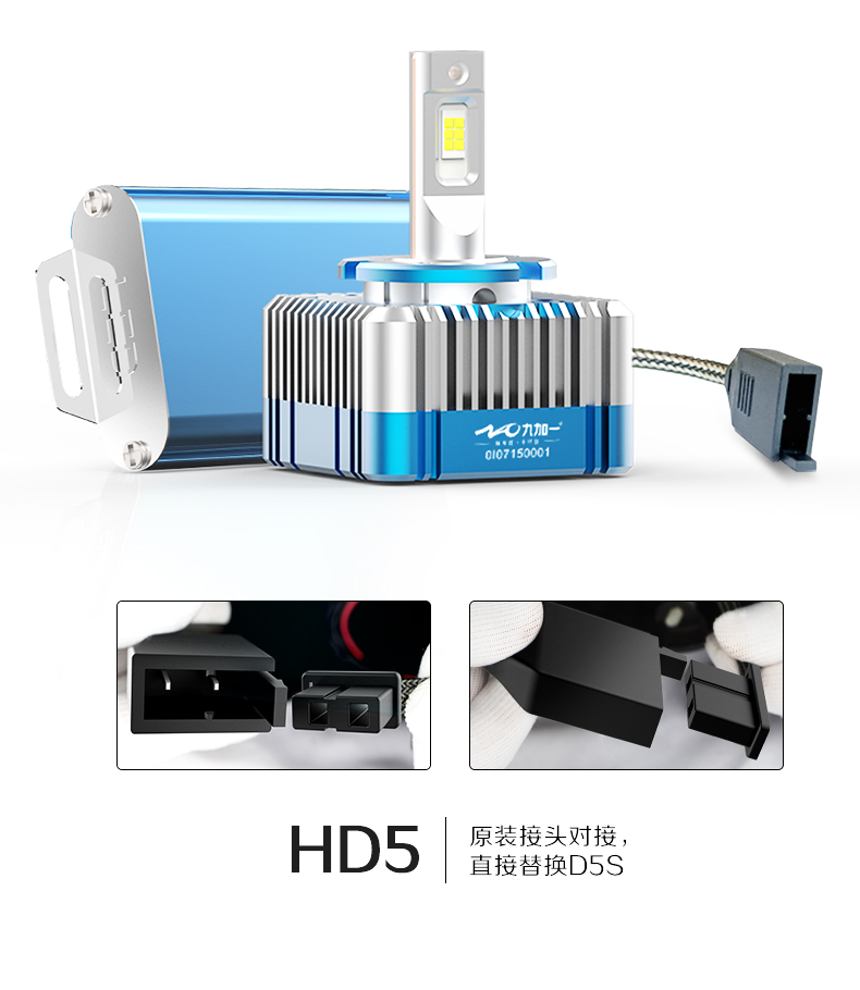 HD5采取原装接头对接,直接替换原车氙气灯D5S,一键解决氙气灯升级系列难题。九加一HD5开启LED直接替换氙气灯新时代。安装九加一直插时式大灯HD5,直插原车电源插头,原装接头对接,安装更简便。此外还采用了三重导热,散热达,九加一HD5,紫铜热管+铜基+6063航空铝材三重导热,散热。HD5创新采用灯体+驱动双重热敏 |