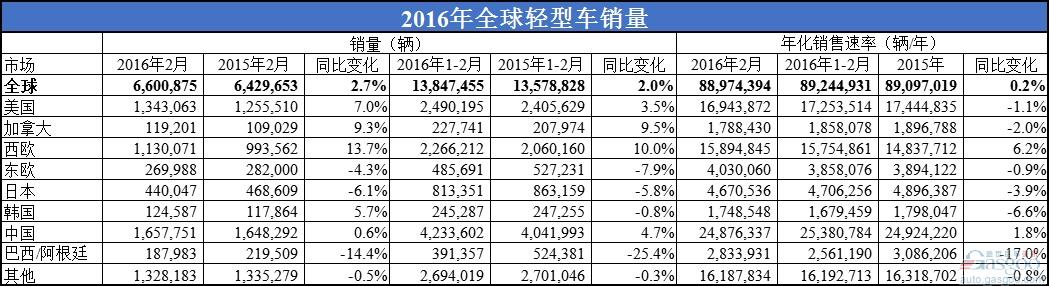 2016年2月,全球轻型车销量为6,600,875辆,较之2015年2月的6,429,653辆,同比增长2.7%。该速率好于今年1月份,当时LMC给的1月全球轻型车销量从7,152,862辆同比增长2.1%至7,302,618辆。不过由于之后数据经过调整,因此最新数据中,1至2月累计销量仅增长2.0%,从13,578,828辆提升至13,847,455辆。